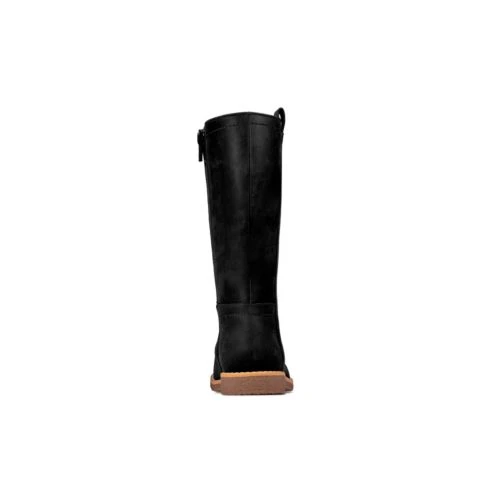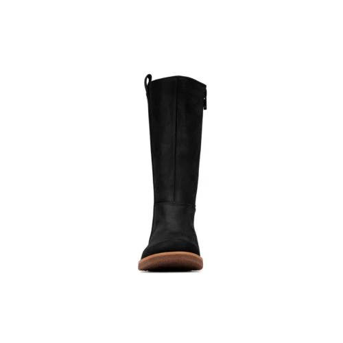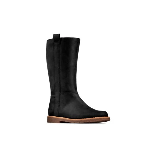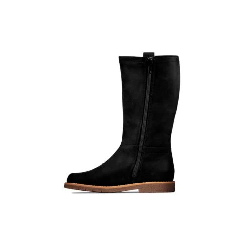 Uncluttered kids knee length boots that tap into classic Clarks design cues. A black leather upper features subtle, crafted stitching and an inside fastening zip, while soft textile linings feel comfortable against the foot. A mixed rubber sole features m
