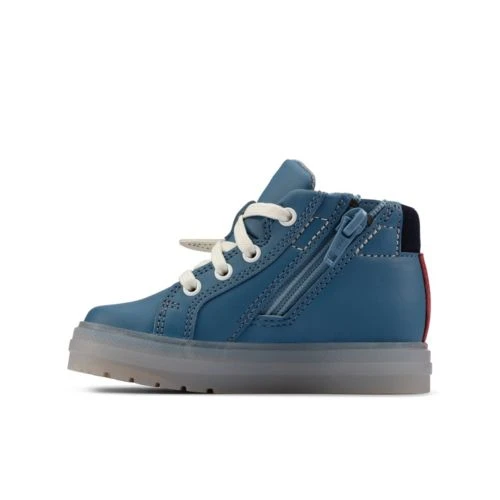 Fresh, modern Flare Scale Hi in blue leather has a light-up sole that shines with every skip, hop and jump, adding extra fun to every-day adventures.