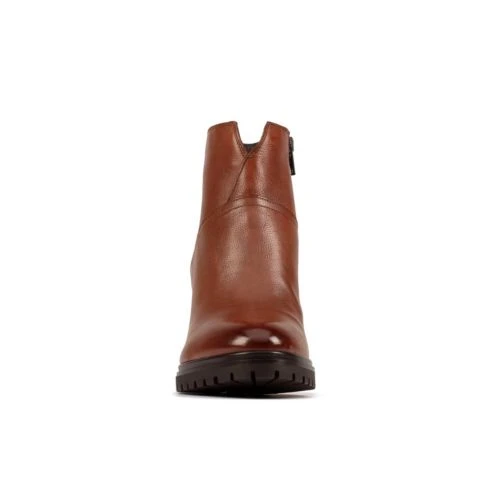 Sleek and modern ankle boots, a stylish wardrobe addition this season. In classic dark tan leather the almond toe shape is offset by the high 8cm block heel and slightly chunky platform sole. An inside zip allows for easy fastening and foot entry.