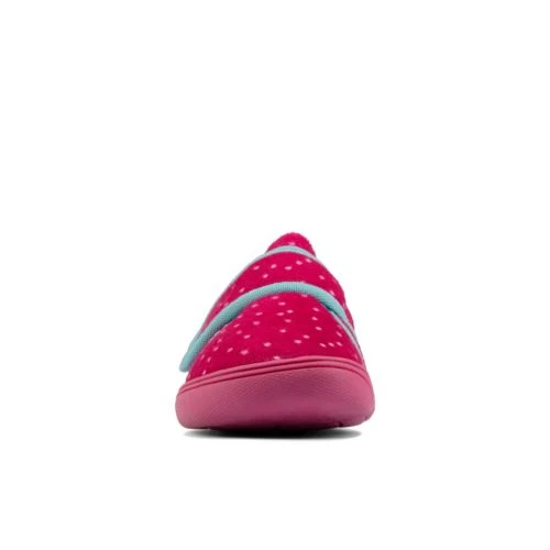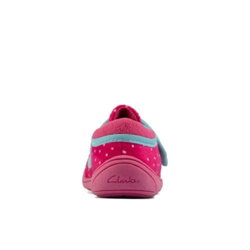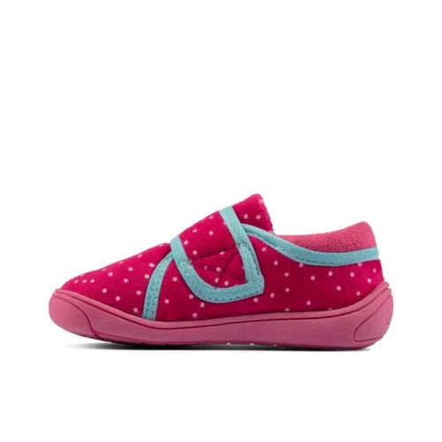 Our cute and cosy kids slippers, designed in a soft pink fabric with polka dot print, and featuring a padded collar for enhanced comfort. The single riptape strap fastens easily for best fit and encourages independence, while a rubber sole adds grip for i