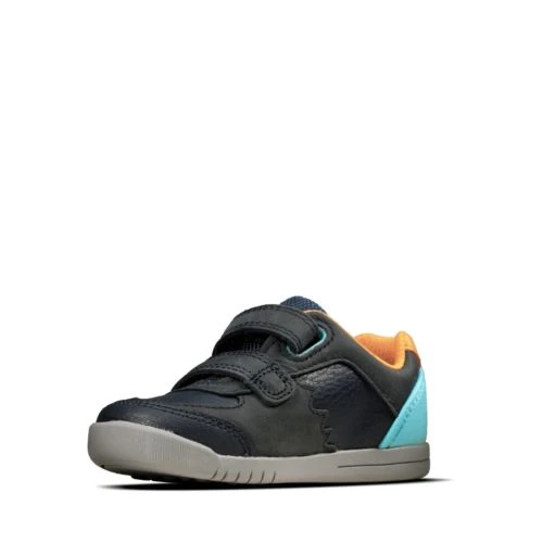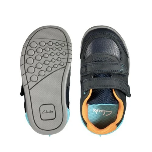 These fun, everyday shoes for kids are crafted from a navy leather with orange and turquoise colour pops. With dinosaur detailing, these shoes feature a toe bumper for added protection, a double riptape fastening for a secure, adjustable fit.